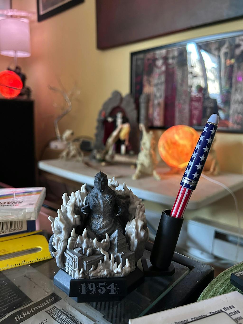 Decorate your desk with the King of the Monsters with the The Godzilla (1954) Desktop Monster Pen Stand. Based on the original 1954 Godzilla movie. Holds one pen. Pen not included.