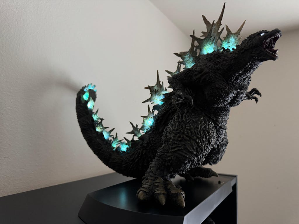 This 11.8" (300 mm) tall non-articulated figure comes with a stand and built-in light-up LEDs, along with sound effects powered by three AAA batteries (not included). Sculpted with exaggerated proportions and exciting paint applications to accentuate the King of the Monsters' raw energy. Heat up your Godzilla Minus One collection with its heat ray effects and righteous roar.
