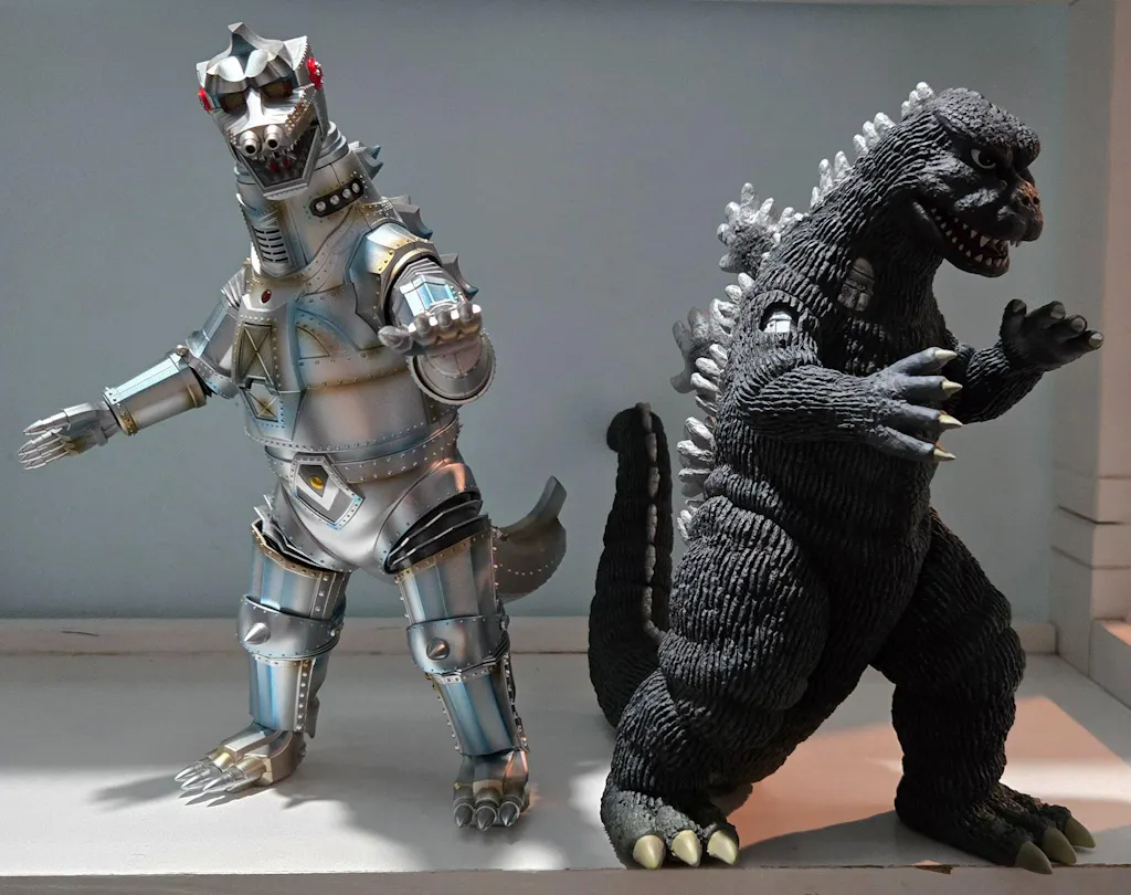 First appearing as the King of the Monsters, this impostor reveals its true nature over time, with metal emerging beneath torn skin until its identity as Mechagodzilla is fully exposed. This figure captures that transformation with incredible attention to detail, from its slightly unnatural features to the subtle differences in head sculpt, dorsal fins, and hand shape that hint at the machine beneath.